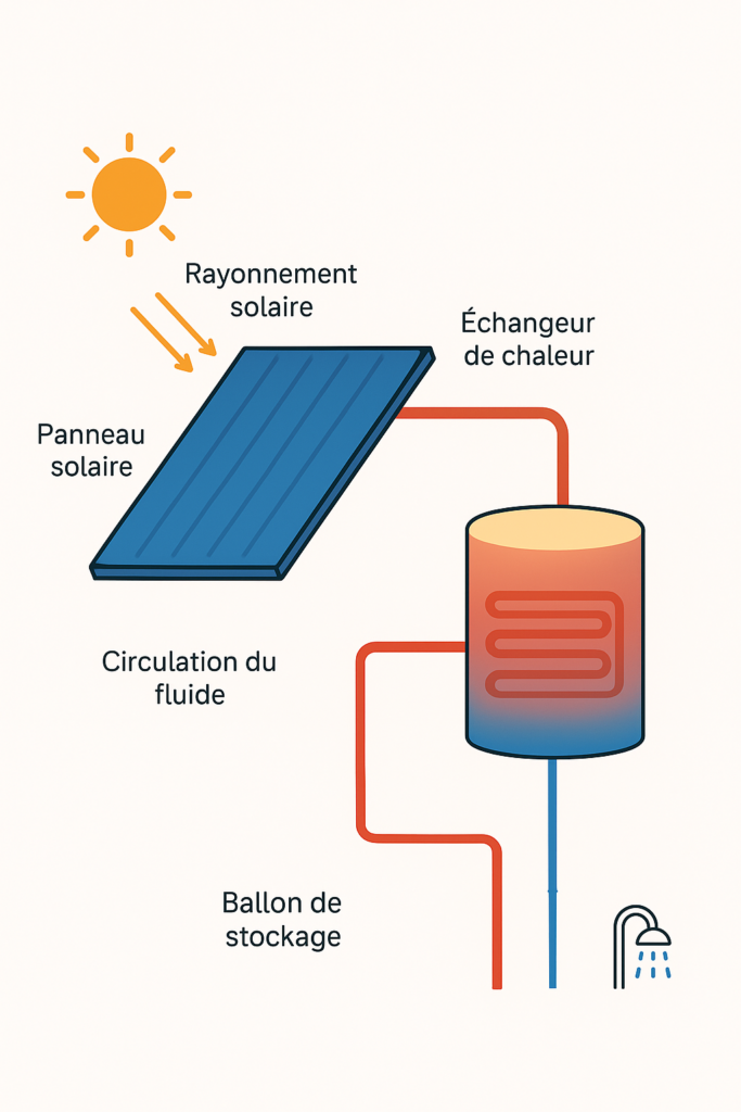 Le principe repose sur la conversion de l’énergie solaire en chaleur. Le système est composé principalement de capteurs solaires, d’un circuit caloporteur, d’un échangeur et d’un ballon de stockage.